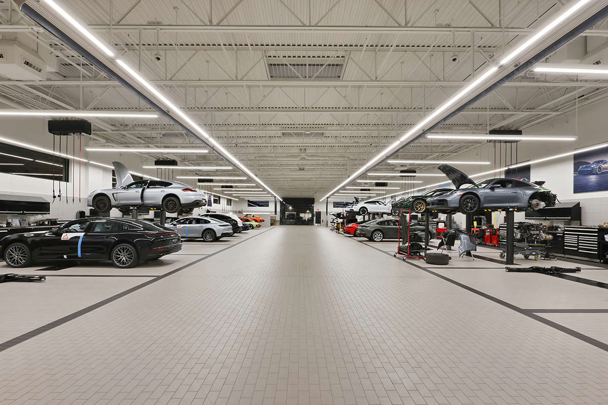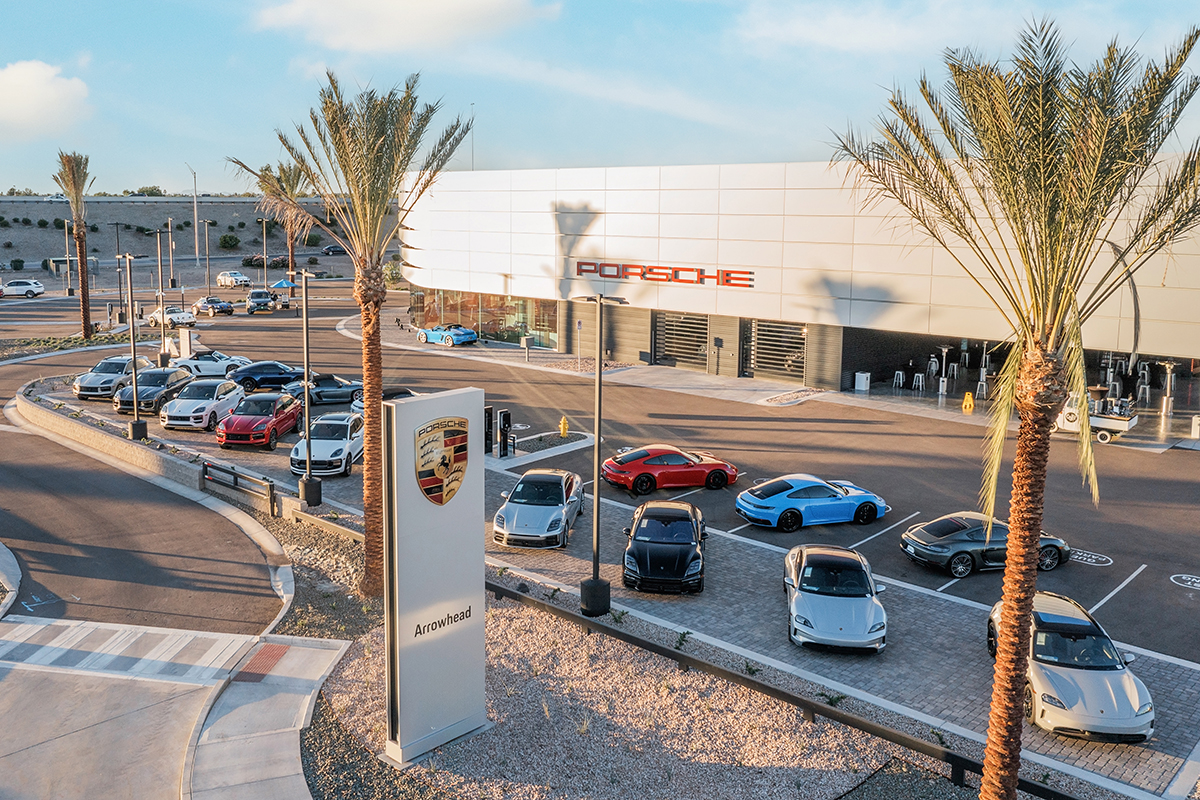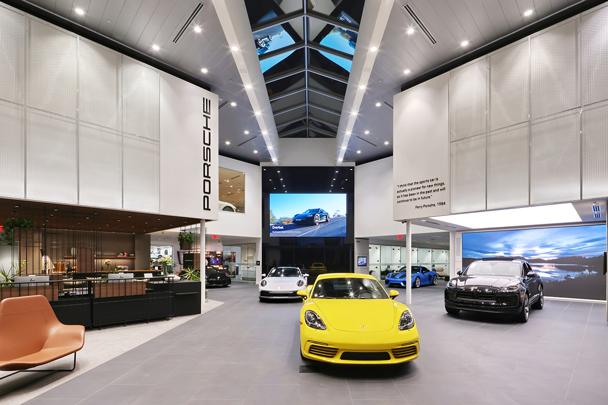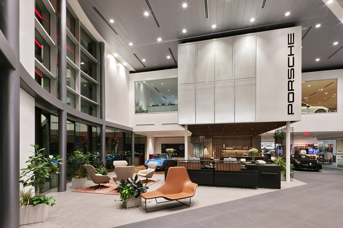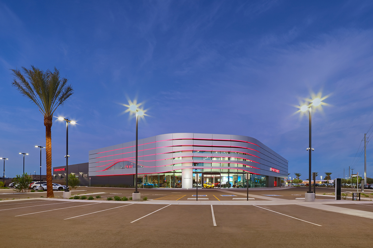 A destination dealership for one of the most iconic brands in the automotive industry.  This facility boasts a 2-story showroom that mirrors the Porsche brand with its dynamic silver shape and interactive modules.  The red LED stripes and second story glimpse car display window make this facility an eye-catching landmark when viewed from the adjacent freeway.  There are two buildings on 6 acres.